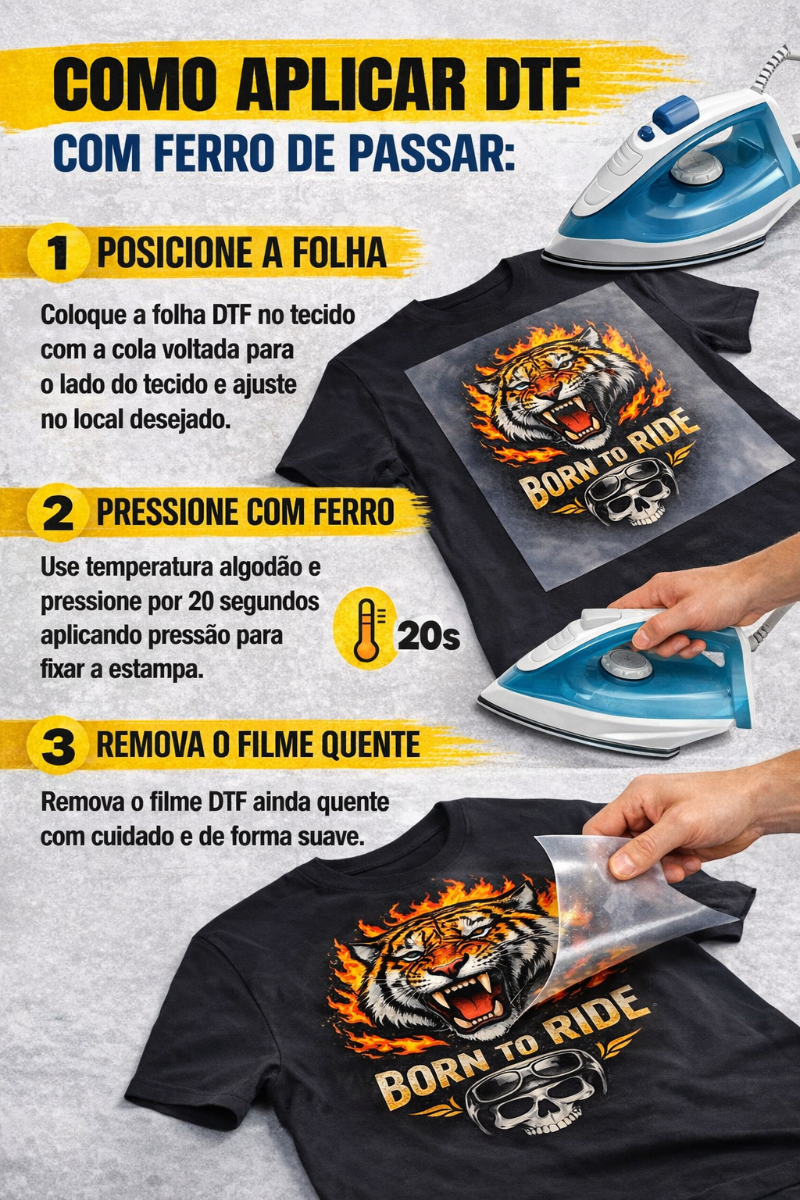 Aplicação fácil com prensa térmica ou ferro doméstico